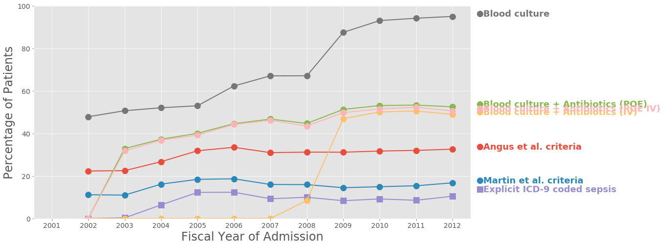 In fact I have been looking into this. I could not find any antibiotic documentation for CareVue patients. I think they simply didn't document it in the ICU clinical information system. I believe the prescription table can be used as a surrogate. As I have access to the year, I've been able to make a useful plot over time which elucidates things: Here I am replicating the Sepsis-3 "suspicion of infection" algorithm: blood culture + anitbiotics. Focus on the middle of the graph: there are three methods presented. The top one (green) is using the prescriptions table, the middle one (pink) is using the prescriptions table but only those with the route specified as IV, and finally the bottom line (orange) is using INPUTEVENTS_MV. As you can see, the bottom line is only available for MetaVision patients, which starts throughout 2008. However, for years after 2008, there is an excellent match between the the IV administration (which we 100% know was delivered to the patient) and the prescription methods (which indicate the antibiotic was ordered but can't guarantee it was administered). From this, I'd pretty confidently conclude that we can use the prescriptions table for determining onset of antibiotics. I have been told by the pharmacy that the prescriptions data was not perfect until around 2007 - but looking at the data I can't see why they state that. It may be that antibiotics were well incorporated but other drugs were not. As always, caveat emptor. |