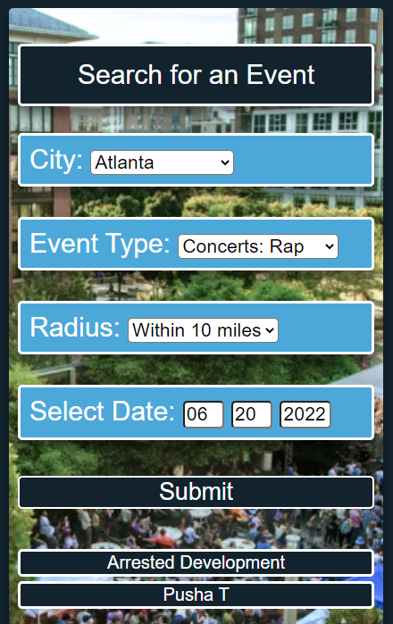 We created this application as a way to find local events or events in major cities, using APIs calls to two different APIs.