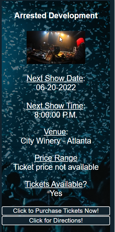 By clicking on the 'Info button', it will show information about the current event on the right panel of the page. You also have the option to purchase tickets, but clicking on 'Click to Purchase Tickets Now! button'. The 'Click for Directions! button' will open a new window to google maps with driving directions from your location.