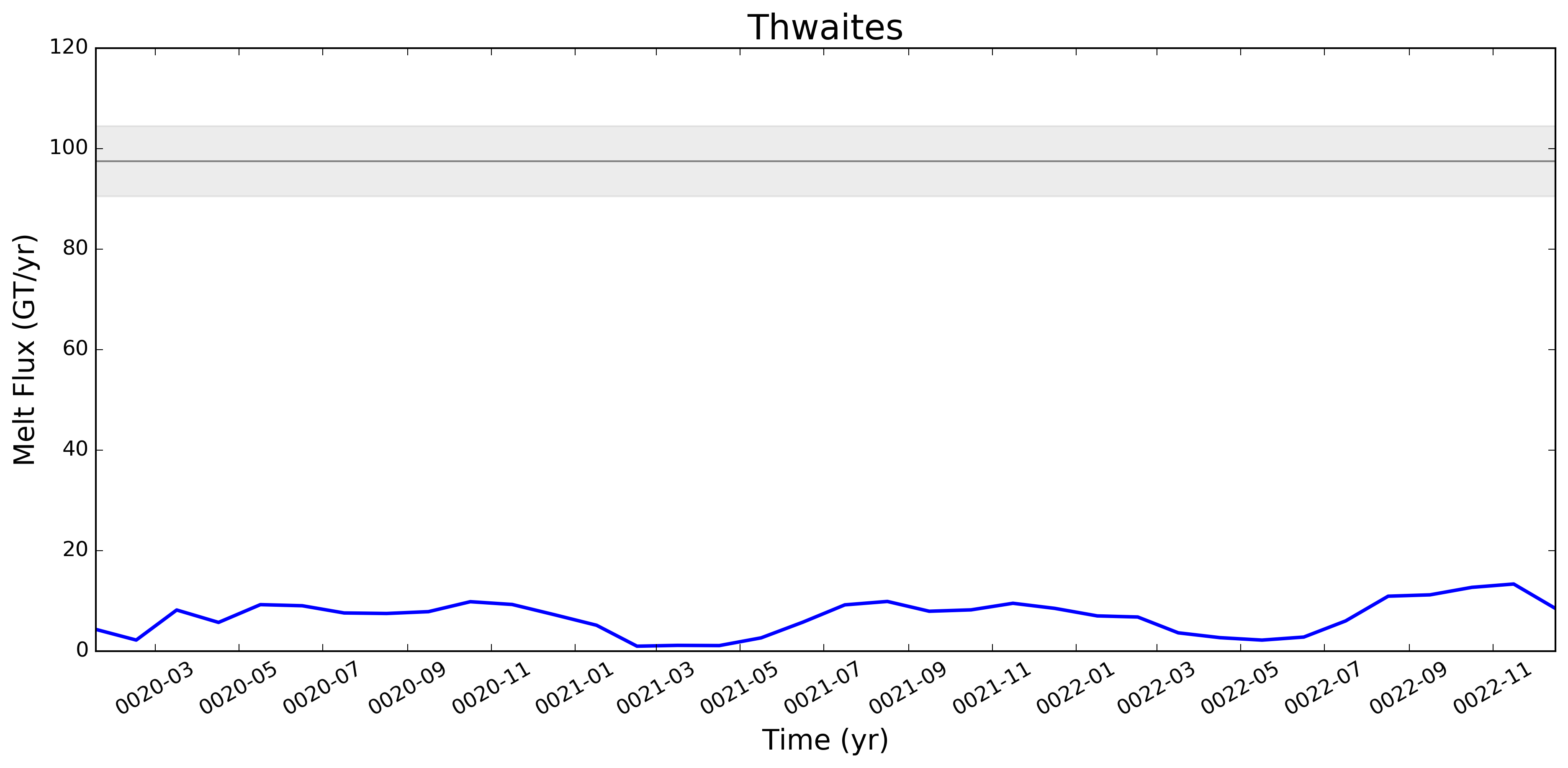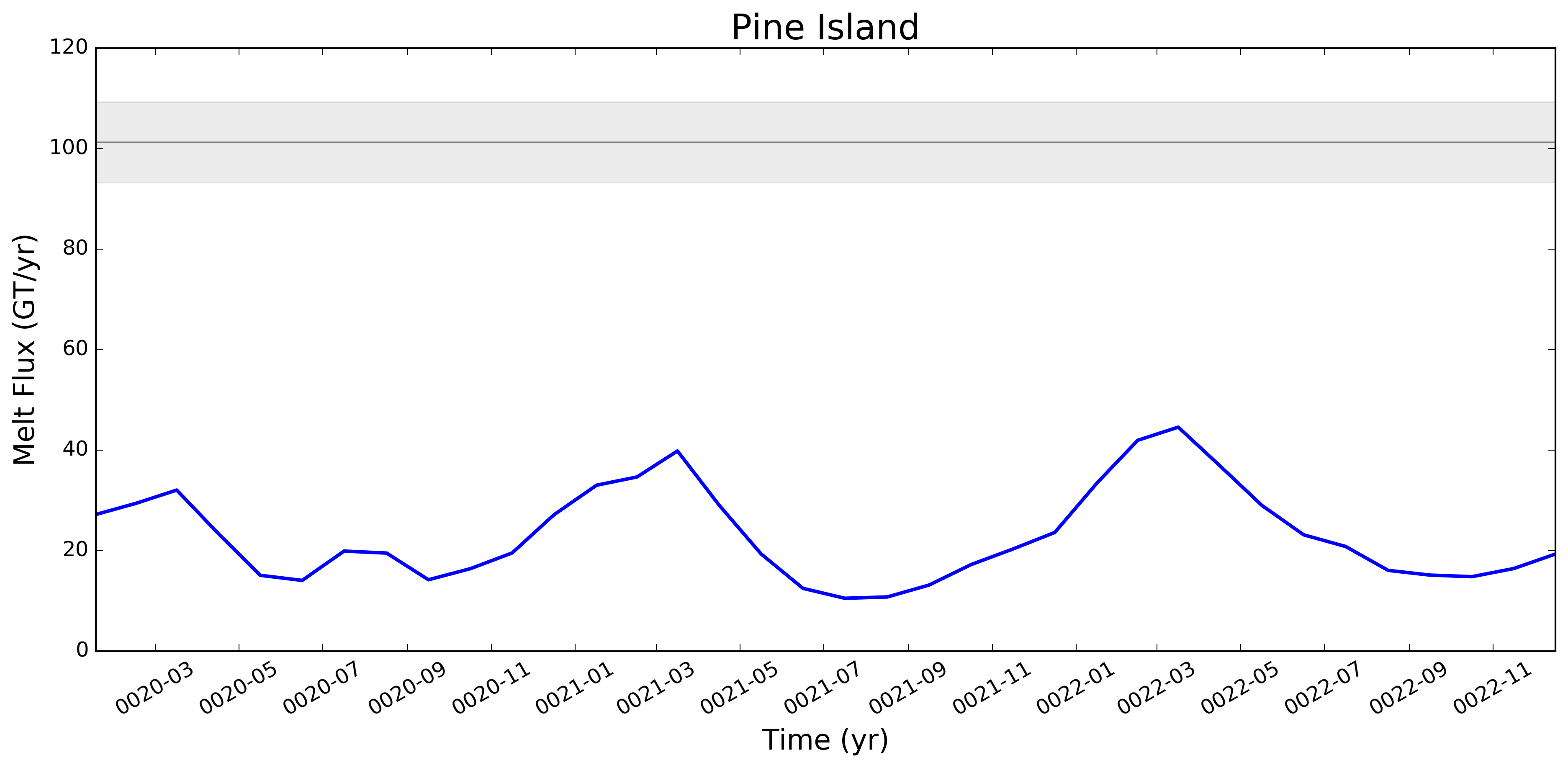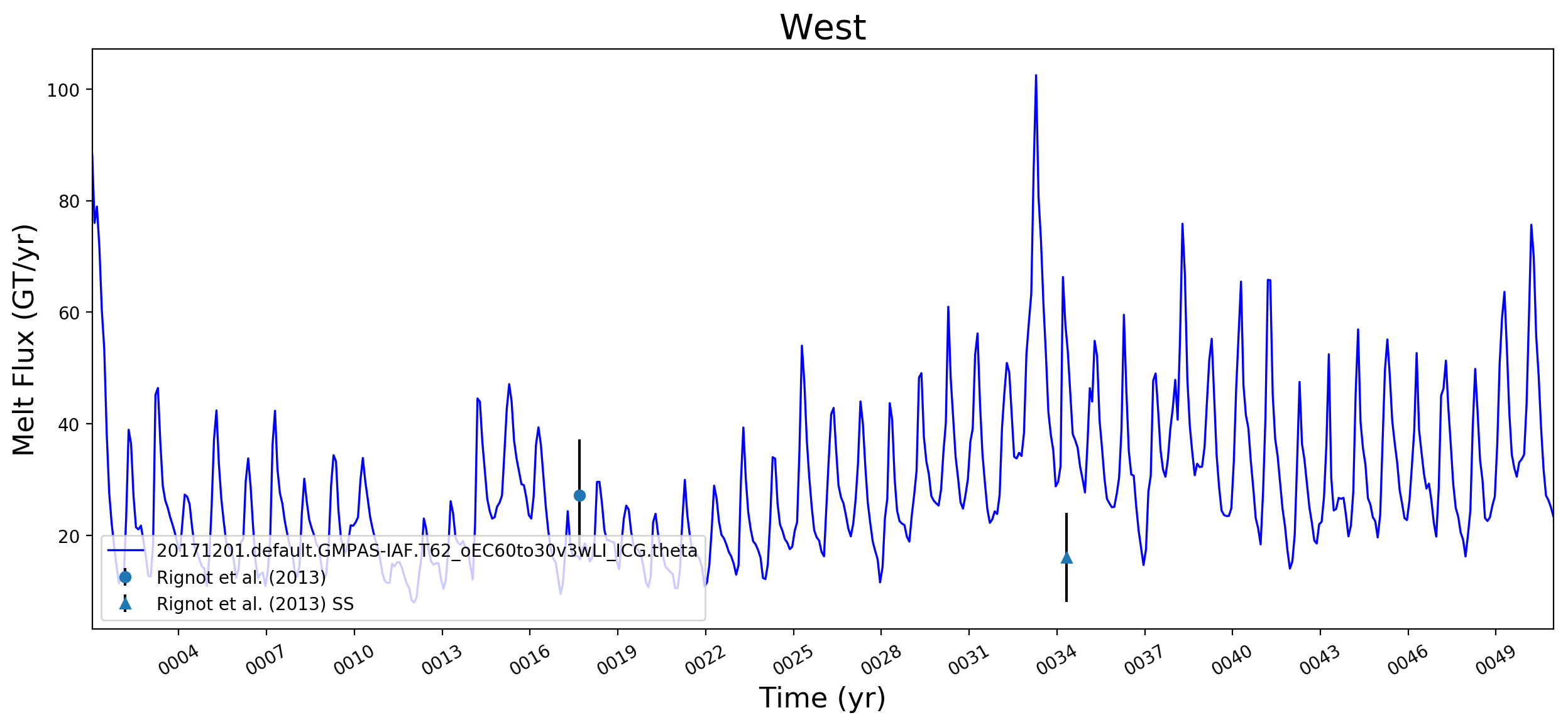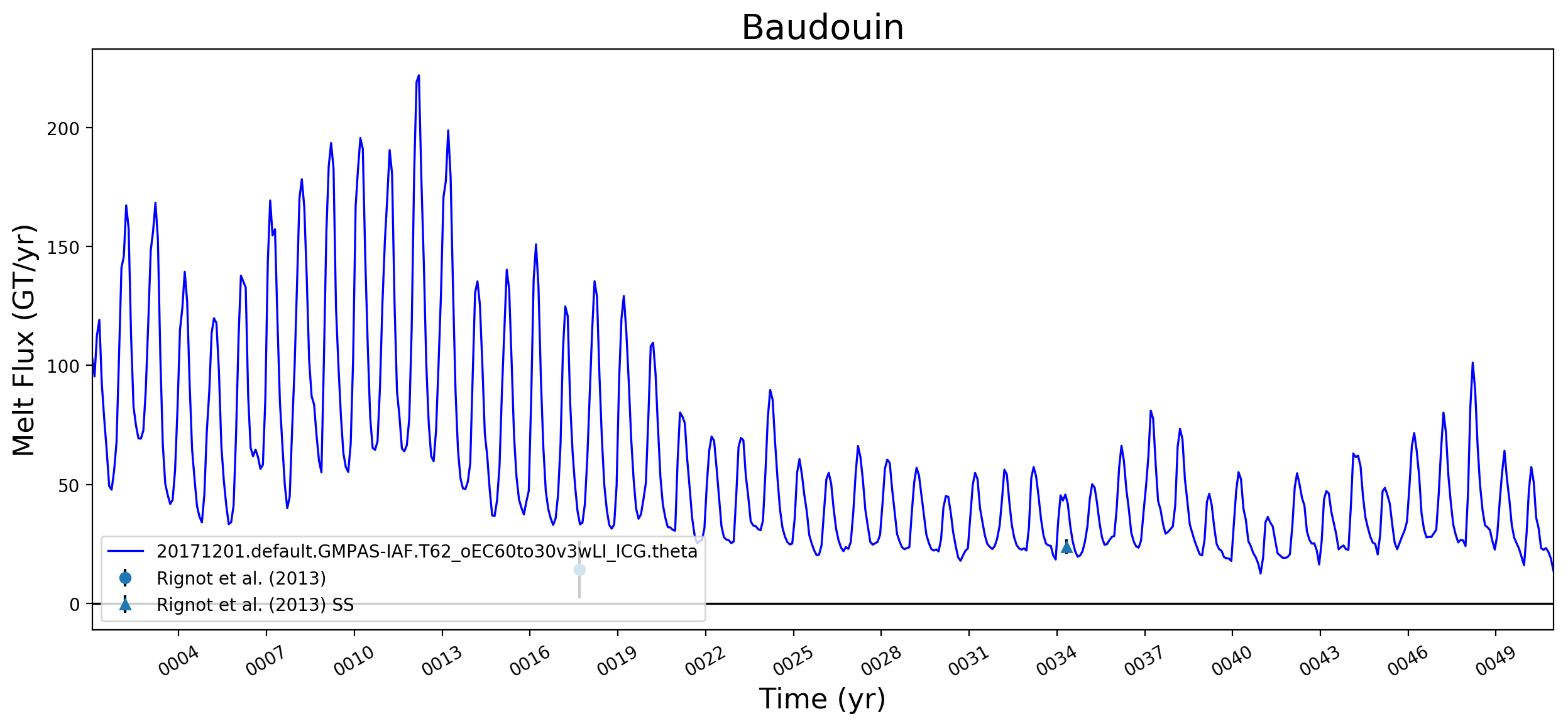 It looks like this is largely working now. Some example figs. below. The good ... But whatever. It will be great to have this capability now. I will try to apply to @JeremyFyke's longer B-case run tomorrow. One interesting thing is that the melt flux vs. melt rate plots don't quite line up the same w.r.t. the observations. E.g. ... I suspect this is because our shelf areas aren't always close to the areas that Rignot et al. used. I'm not sure if there's a way to fix this, or if we should just plan to mainly look at melt flux rather than melt rate if we want a really accurate comparison. I should note these are from the old AGU 2016 runs. The same analysis applied to the more recent runs looks a bit better. I'll post some figs for tomorrows meeting on this. |