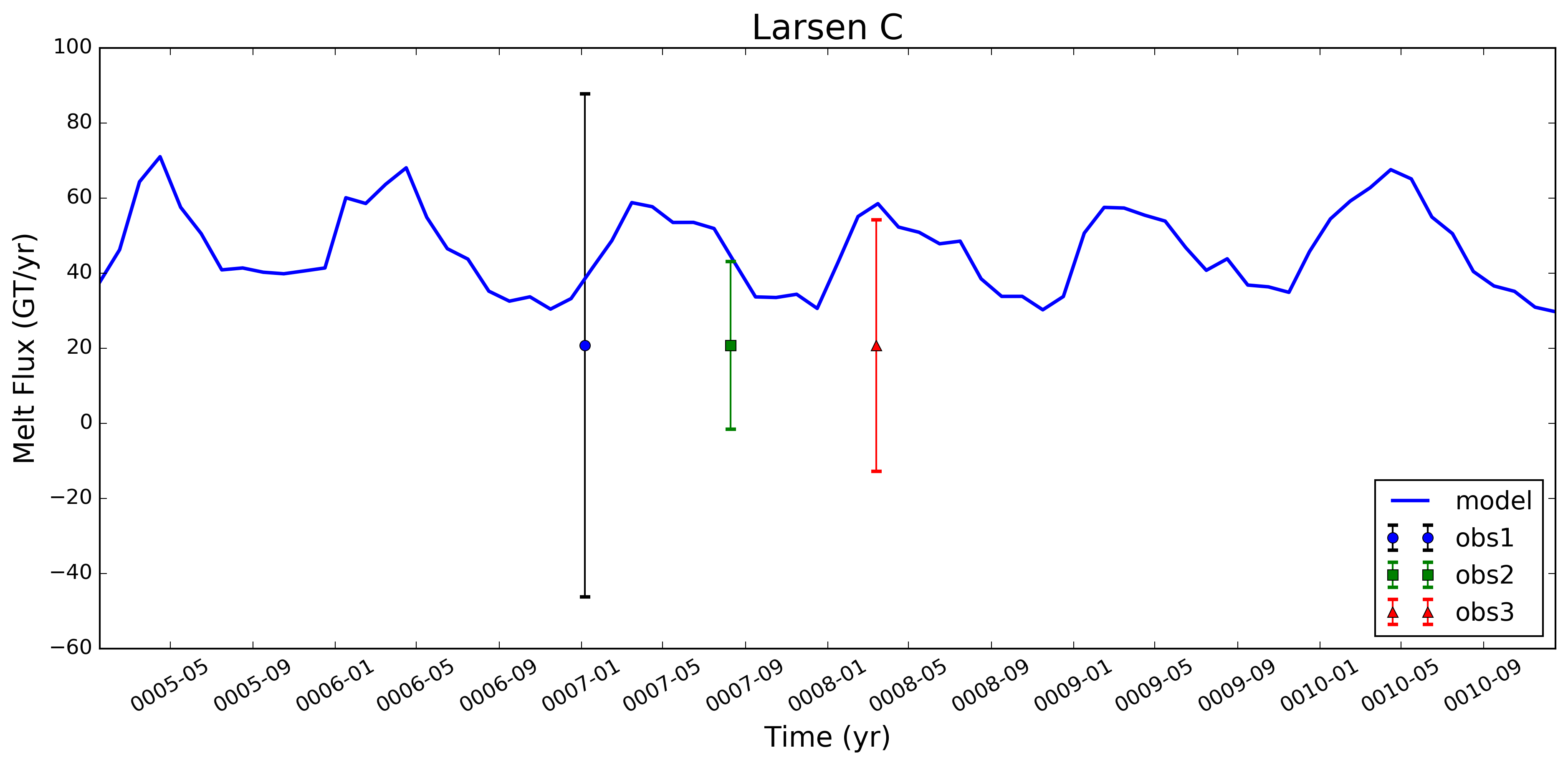 @xylar -- I've been thinking that when we add a few more obs. datasets in here (e.g., Depoorter and Moholdt), it might be better to include the obs. and unc. as simple error bars. Here's an example for what that might look like (I just plotted the same set of errors 3 times, w/ the 2nd two instances divided by a scalar - just to get the idea across). I still need to look at the logic for iterating over multiple obs. data sets, but I don't think that should be too hard. Let me know what you think. Flagging @JeremyFyke for his thoughts as well. |