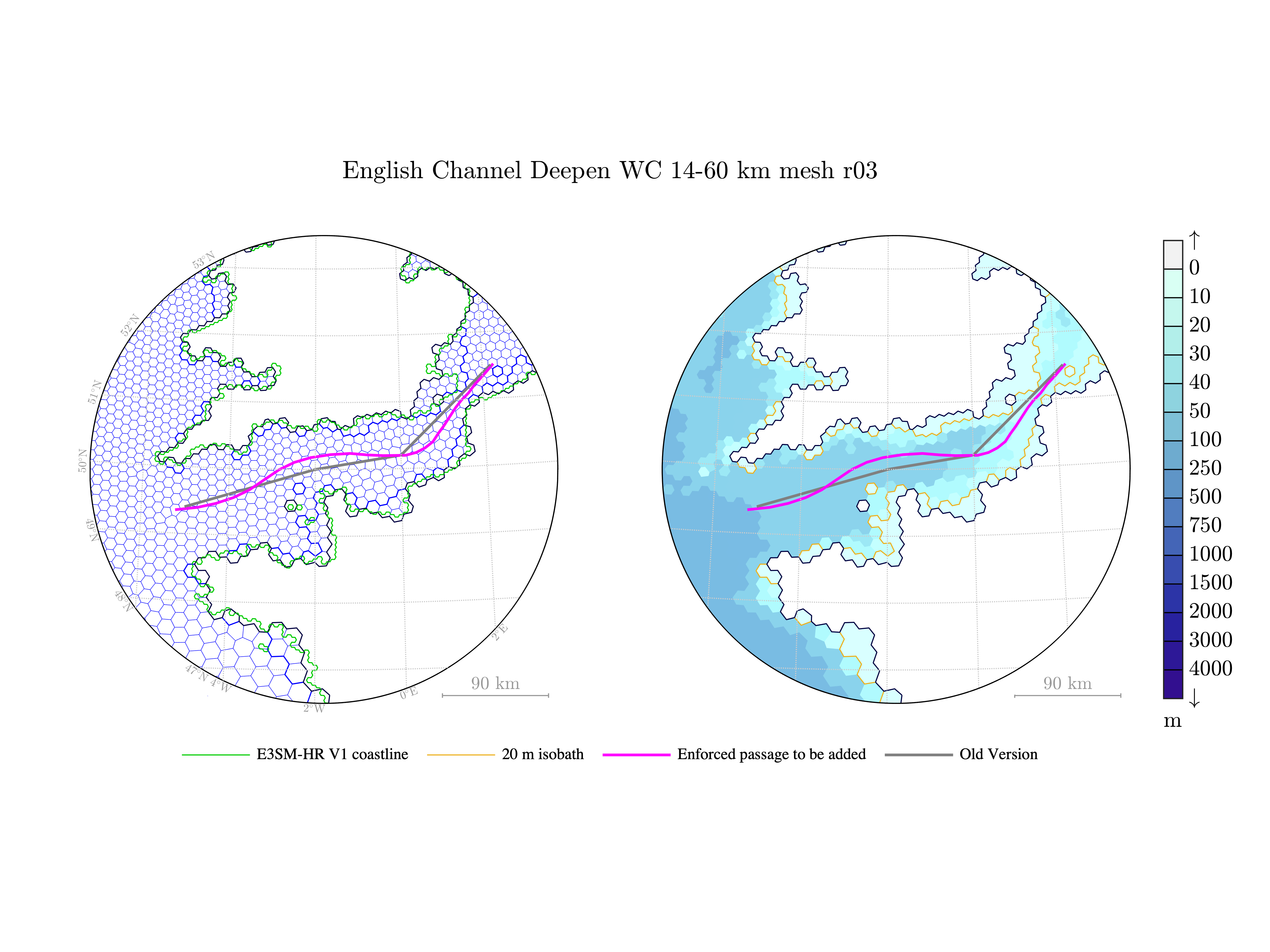 a) An attempt to fix the English Channel, which for some reason is heavily widened in WC14r03 and previous meshes at the Pas de Calais as compared to the real world. The English_Channel_Deepen addition of @mark-petersen has been altered to include a higher resolution and slightly shallower transect (100m versus 120m). Should this also prove inadequate, then there may be other problems with geometric features prescribed in the Channel. The fix is annotated here: