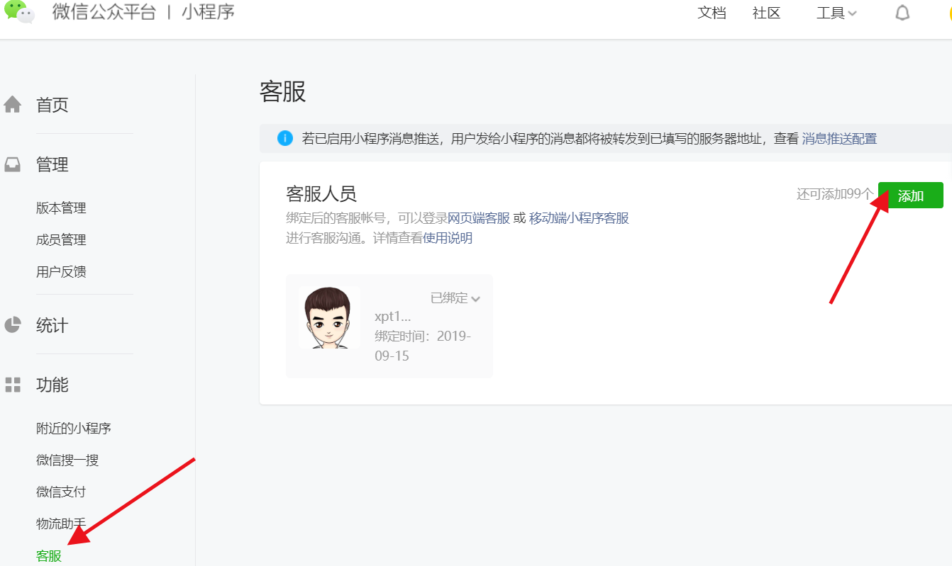 打开【设置】--【客服】--【添加】,绑定成功后,打开小程序【客服小助手】,状态设置为在线即可,到时候有客户咨询自动会推送到你的微信号上的