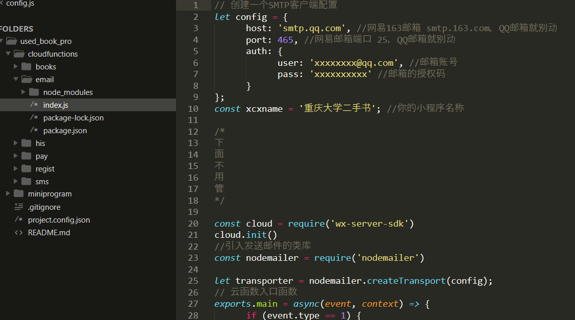 每个云函数要修改的部分,我都捻出来放在了顶部,直接根据我做的注释信息进行修改,如下图所示