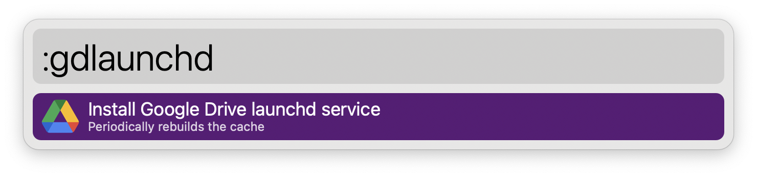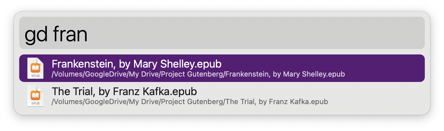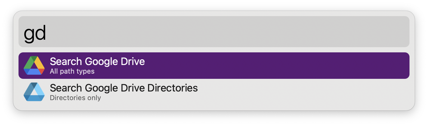 When done, call gd and type to filter the contents of your Google Drive. gdf limits the search to directories. Use ↵ to open the path, ⌥↵ to reveal it in the Finder, or ⇧↵ to search it in the web browser.