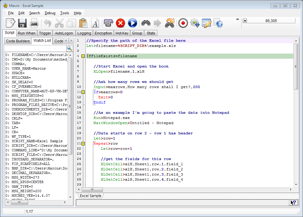 - Script Editor with Debugging – Write, step through, and inspect variables inside Macro Scheduler.