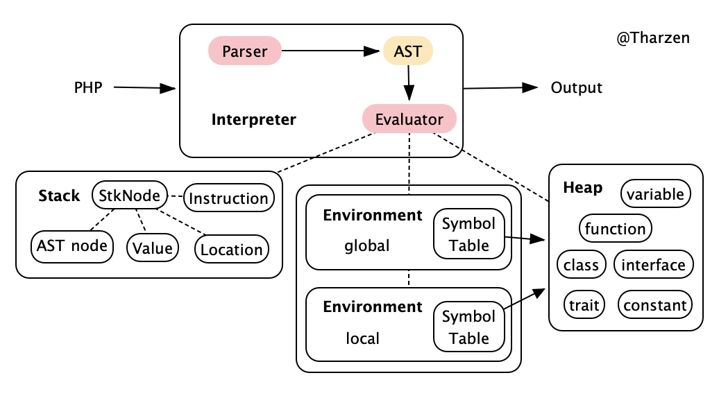 And there is a global Heap stores all the variables and other things needed to be stored, such as function, class, interface, trait, namespace declaration in environments in case we'll use functions or create new objects of some classes defined before.