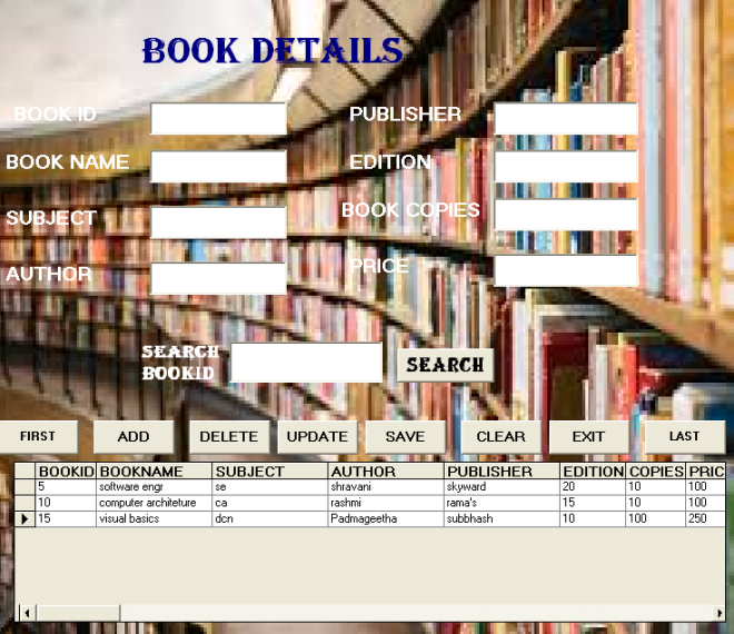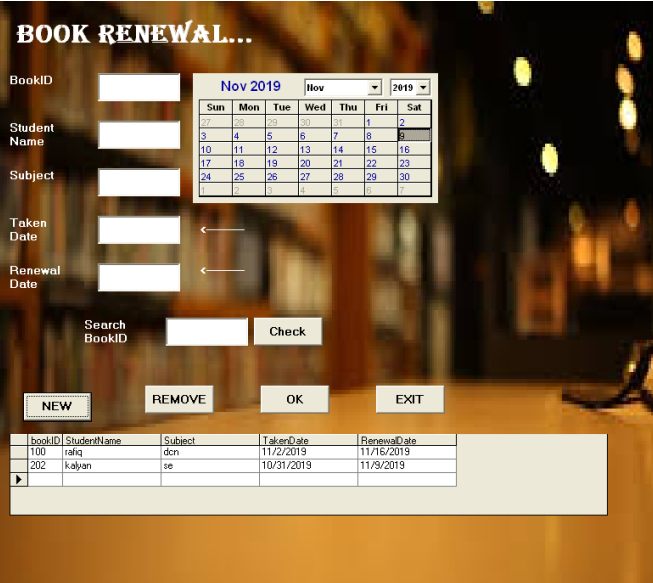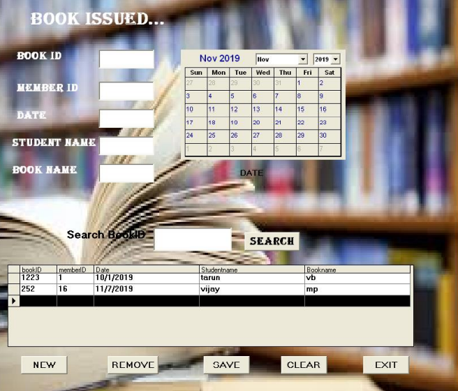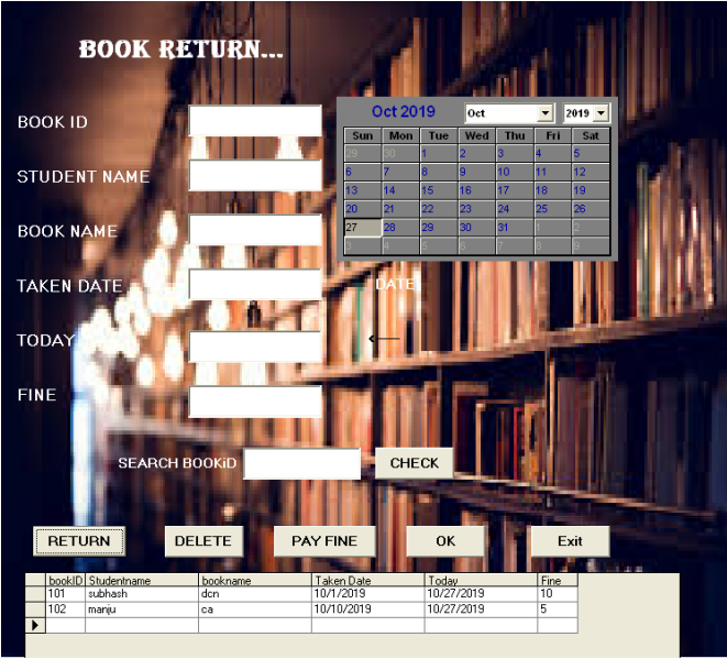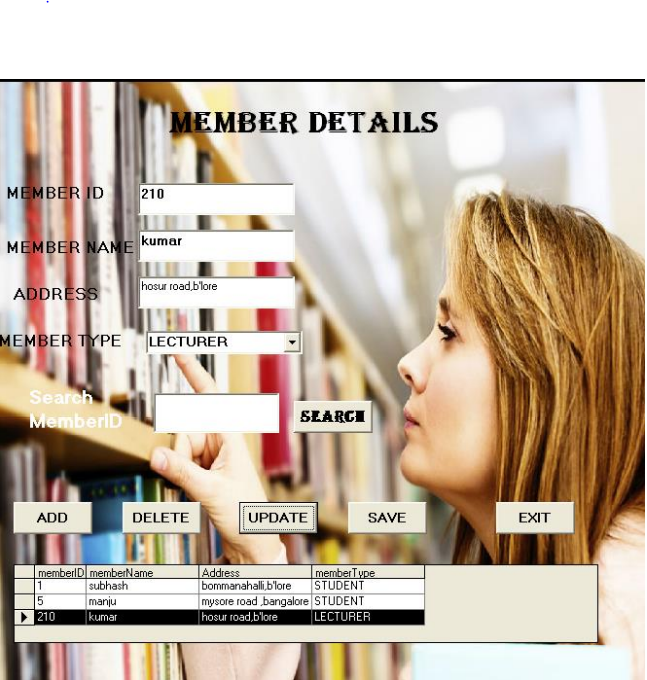This application can keep track of the members joining and leaving the library, borrowing and returning of the books. Checking the availability of the books using different attributes as parameters. Finally checking of the overdue books and fines payable is another eature of the system.