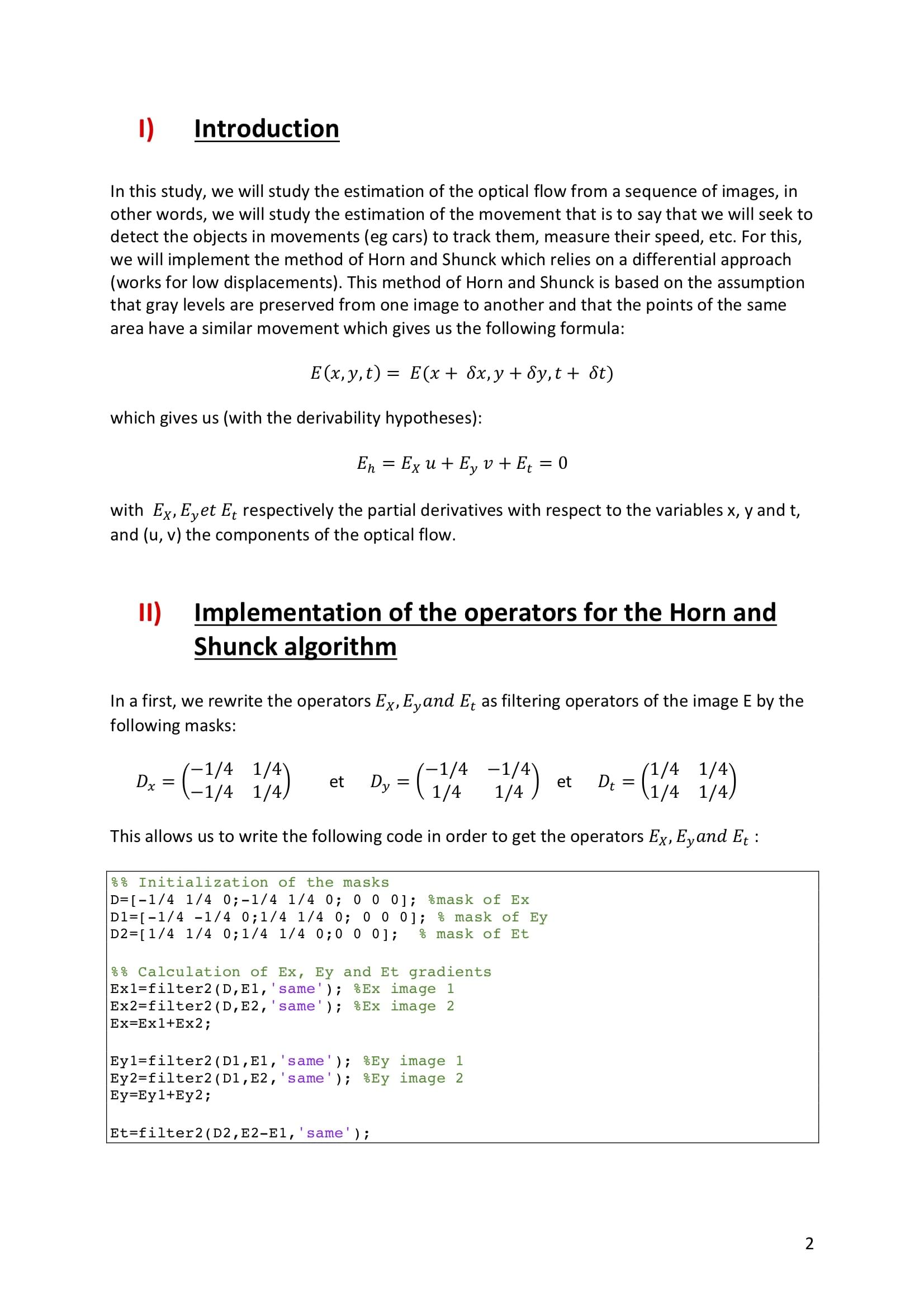 Here we estimate an optical flow from a sequence of images, in other words, we will study motion estimation, that is, we will try to detect objects in motion (eg cars) in order to to follow them, to measure their speed, etc. For this, we will implement the method of Horn and Shunck which relies on a differential approach (works for low displacem…