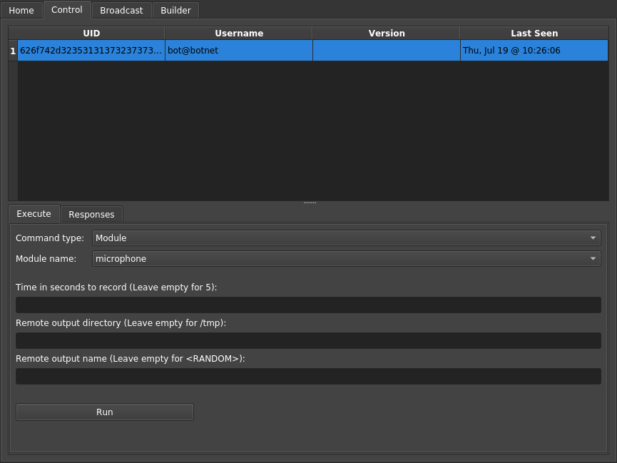# Lastly, run a built launcher on your target(s)Warning: Because payloads are created unique to the target system (automatically by the server), the server must be running when any bot connects for the first time.