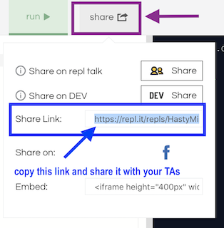 When you are done and you have checked that everything works fine, click on the Share button and copy the link from the Share Link field. Send this link to your TAs so they can check up your work.