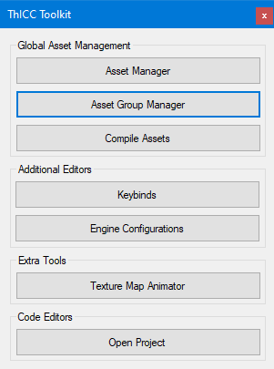 The core of the engine backend relies on the "ThICC Toolkit" which allows access to most of the engine's core features through a GUI with a range of functionalities for asset importing (models/sounds/images/etc), configuration customisation (fonts/keybinds/cameras/glyphs), and a series of other things. We also embedded some more bespoke features into the engine toolkit, for example, item configurations.