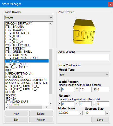 Levels are created for the engine through Blender, which utilises our own plugin that I developed for placing points in the world representing collision volumes (for lap checkpoints), item boxes, and more. This is a nice graphical way of adding entities within the map without using magic numbers. A level in the engine is built up by one or two models, one model supporting mesh collision, and the other being effectively background scenery. This was implemented later in development as we reached memory caps with larger levels as just one SDKMESH.