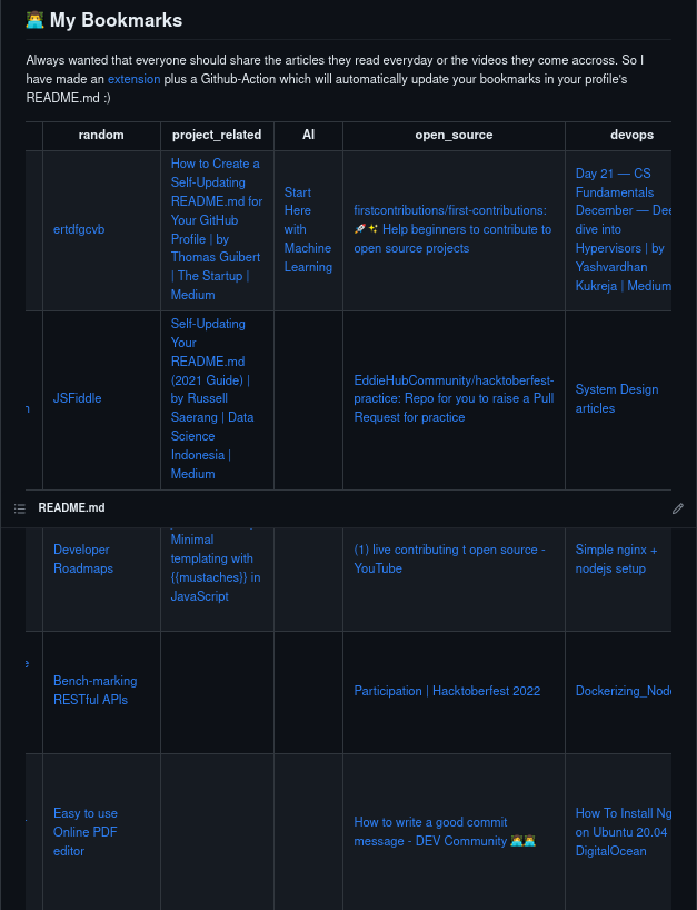 Collects information of your bookmarks in your browser and then update that to your github profile's readme.md automatically. You can check it out on my github profile