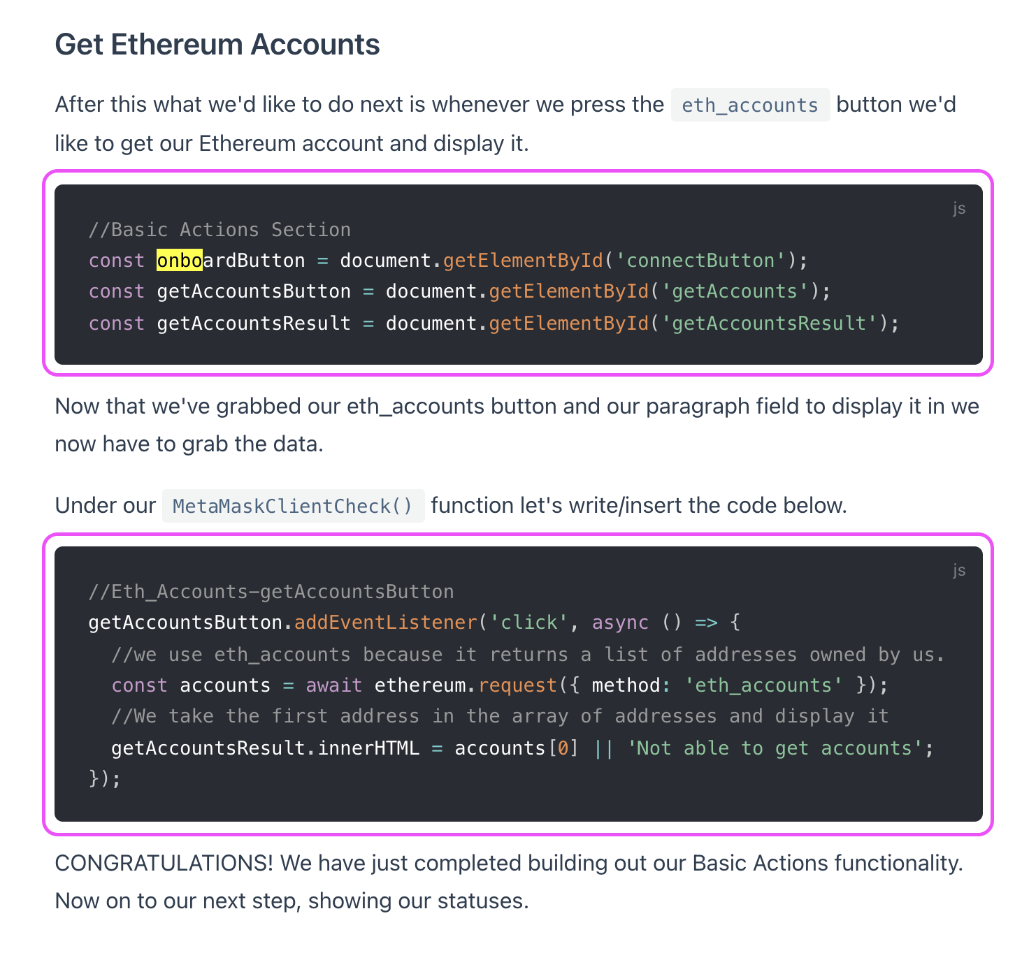 The "Create a Simple Dapp" tutorial on the MetaMask docs site has a few instructions that we can add to ensure better readability and a better understanding of where the code samples in the tutorial should be placed.