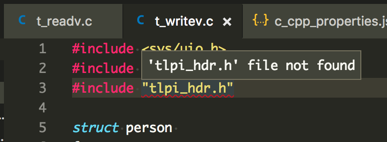 <img width="392" alt="2017-11-04 1 01 50" src="https://user-images.githubusercontent.com/10754726/32402512-c9a96ab6-c0f3-11e7-8377-08251e8bdfa4.png"> `tlpi_hdr.h` path is `${workspaceRoot}/lib/` and my includePath configuration: ``` "includePath": [ "/usr/include/c++/4.2.1", "/usr/local/include", "/usr/include", "${workspaceRoot}/lib", "${workspaceRoot}" ] ```