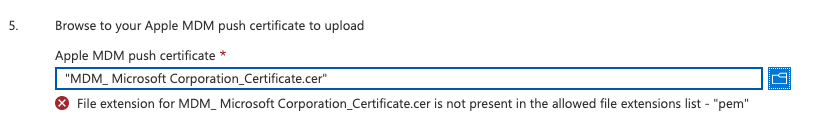 The apple push certificates portal no longer downloads the certificate as .PEM ... it now downloads as .CER and needs to be renamed to .CER in order to circumvent this check: https://pbs.twimg.com/media/FaezjUEVsAArt8A?format=png&name=900x900