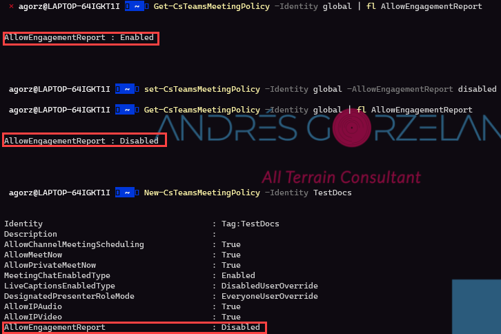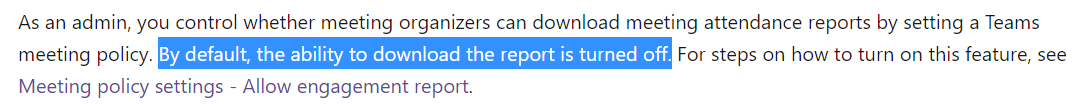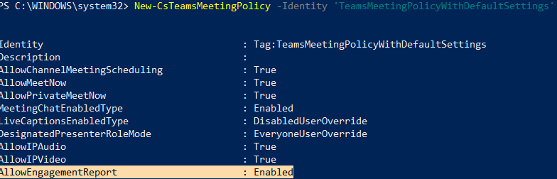 The default value for AllowEngagementReport is Enabled if no value is specified when the Teams meeting policy is created from PowerShell. This is the opposite of what happens when a new meeting policy is created in Teams admin center.