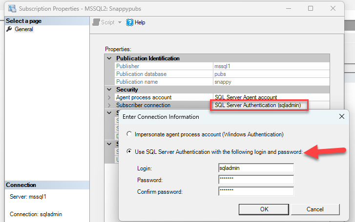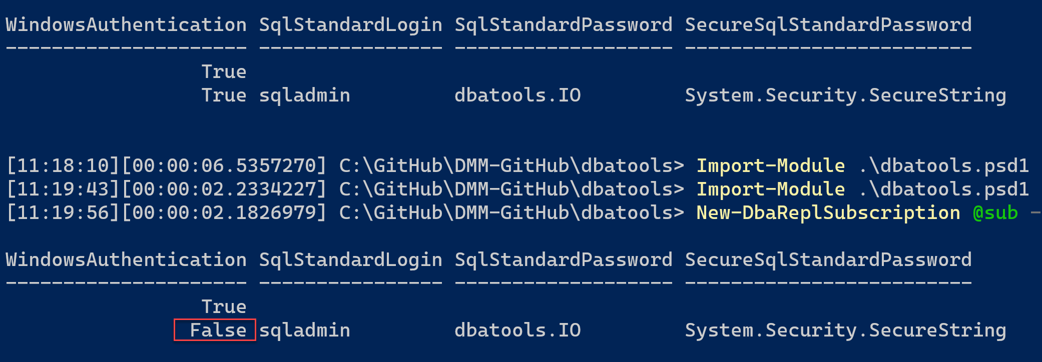 setting to False for the change to be picked up.Following the docs I ended up with True still for WindowsAuth and it didn't show the change in SSMS\replication monitor. The second results set shows setting it to False.