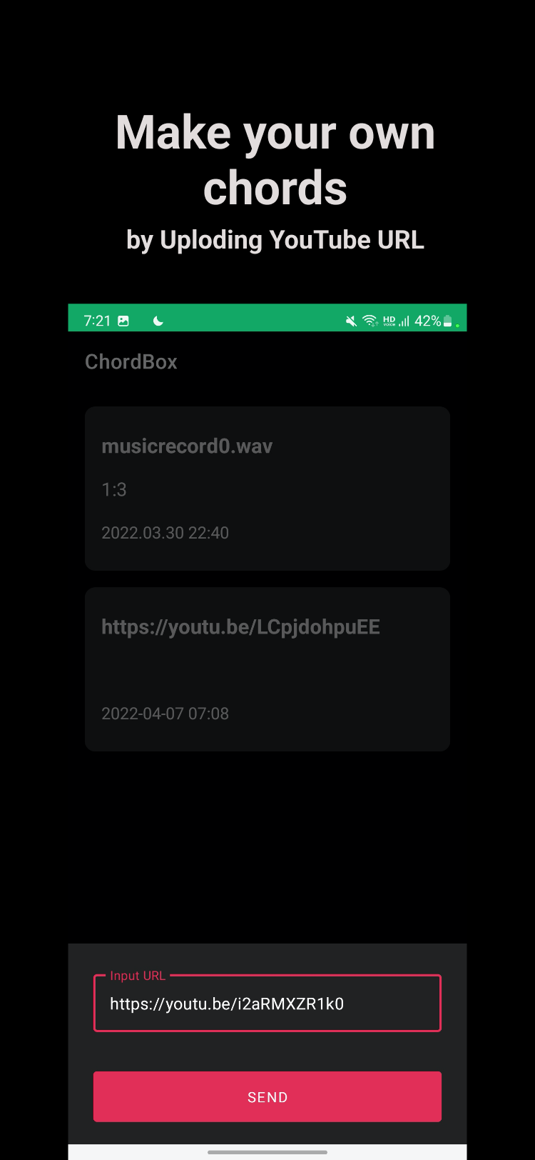 ChordBox 1. 사용자로부터 물리적인 음악을 앱으로 녹음받아 음원분리와 코드인식 기술을 통해 코드를 생성해주는 AI 앱 2. 사용자로부터 Youtube URL을 전달받아 코드인식 기술을 통해 코드를 생성해주는 AI 앱 앱 구조 Video Dependency iiVisu