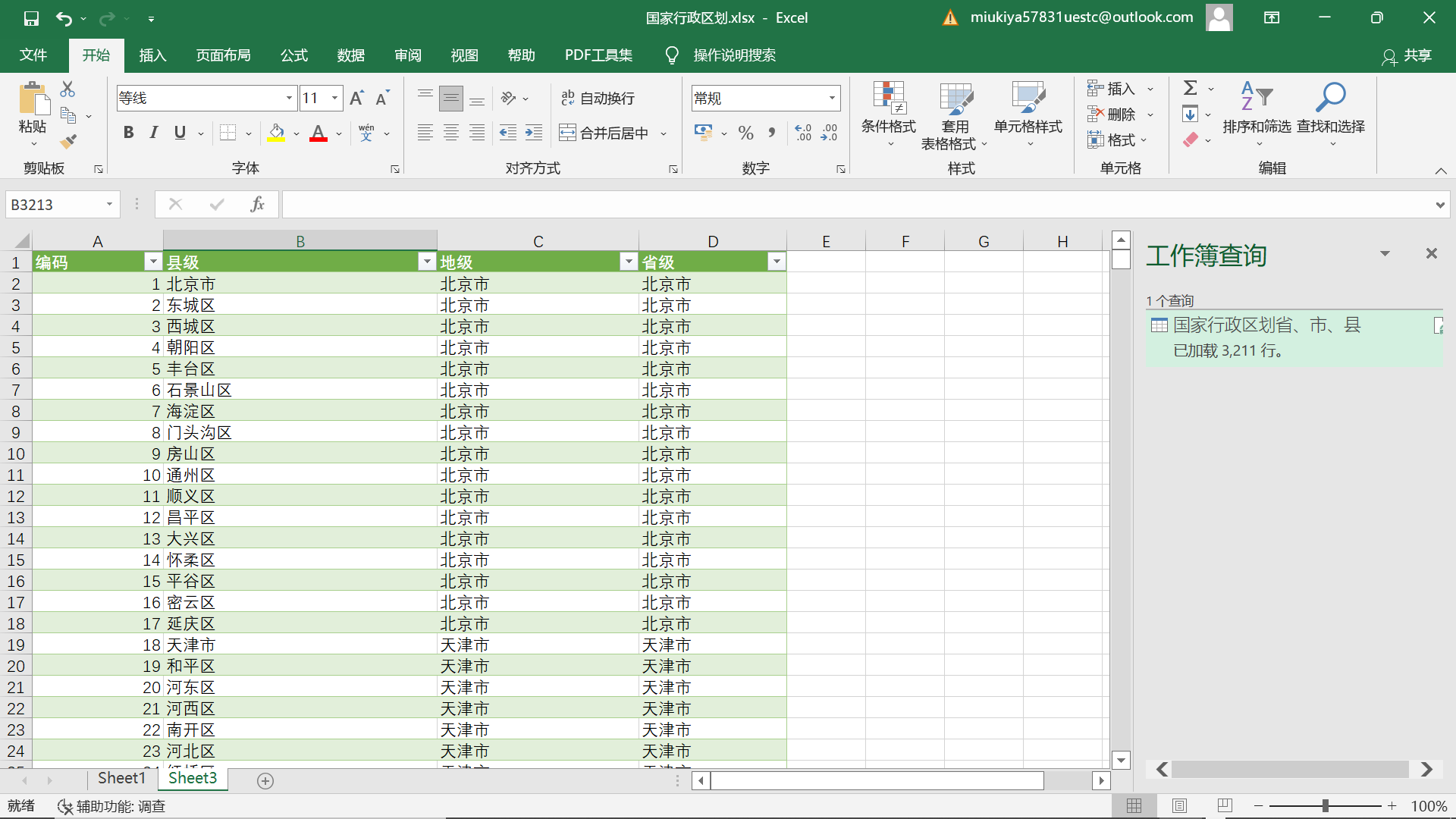 从国家民政部官网中将国家行政区划数据导入excel,按省、市、区录入