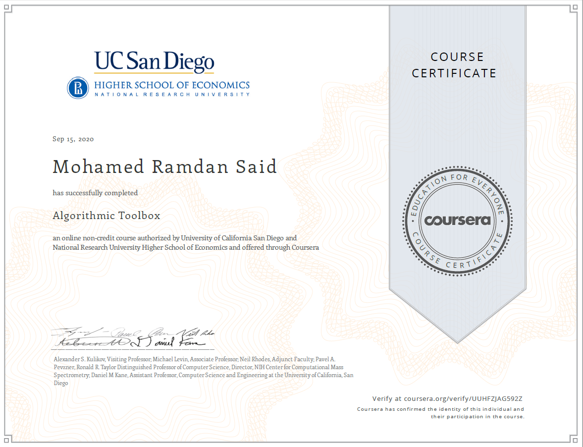 I've completed Algorithmic Toolbox Course of 'Data Structures and Algorithms Specialization' offered by university of california san diego.