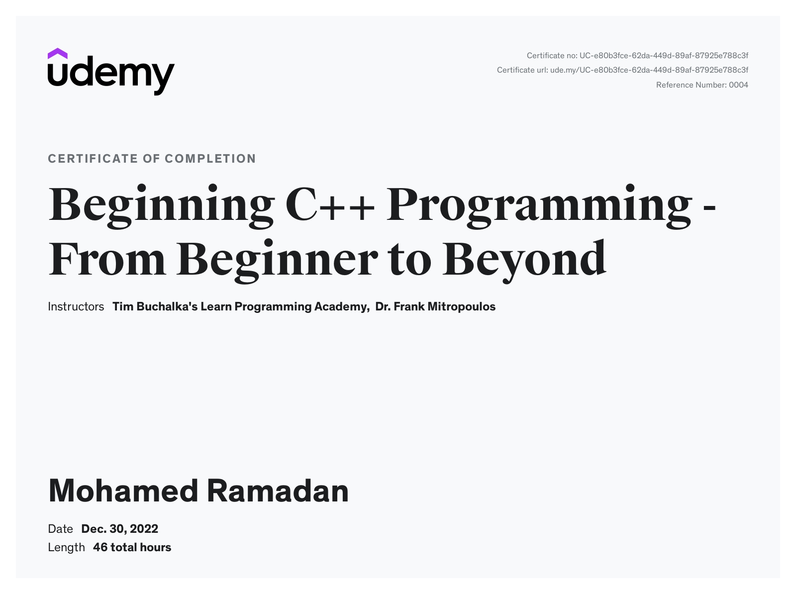 I've completed "Beginning C++ Programming - From Beginner to Beyond" udemy course offered by Dr.Frank J. Mitropoulos.