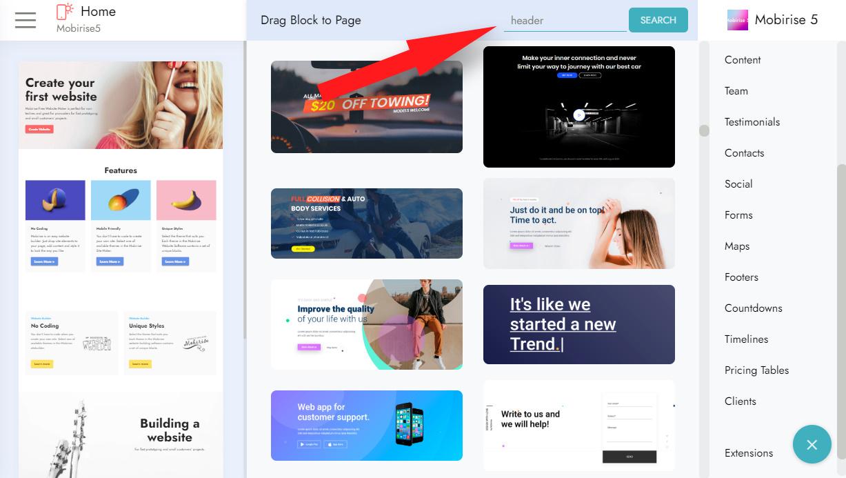- Search through all Mobirise blocks