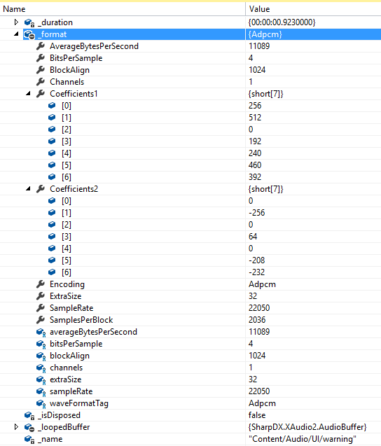 I added an alternative build of our opengl game to be able to render in directx. The audio worked in opengl. But in directx I get this problem. All of our raw audio is converted to pcm via ffmpeg. Has someone found a workaround for this? Though maybe my error is just the same but is unrelated. I was using ffmpeg to decompress adpcm and ogg audio. And feed to dynamicsoundeffectinterface and soundeffect. |
