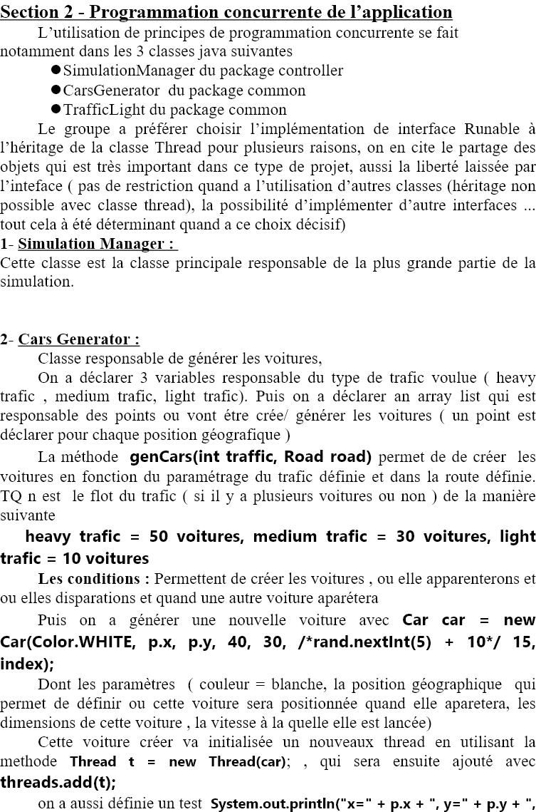 Le même principe est posée et utiliser pour les autres routes avec différents ID, les routes adjacente on le même code car elles s’exécutent en parallèle ( par exemple route id 1 et id 5 sont des routes parallèle ). 4- Section 3- Programmation non concurrente de l’application 1- package model Ce package regroupe deux classe Direction.java et Car.java Car.java : On a commencer par définir les valeur graphique usuelle de la voiture avec dans l’ordre: sa couleur ,sa position géographique, sa hauteur et largeur, et sa vitesse...etc Les variables proximity permet de définir la proximité par rapport au autres voitures, et passed définie si la voiture passe ou non Dans la méthode Car(Color color, int x, int y, int width, int height, int speed, int lane) la variable lane entrée en paramètre, permet de définir la direction de la voiture exemple excplicatif : if (lane == 1) { this.direction = Direction.N_SE; this.indexSem = 3; } /* lane = 1 donc signifie que la voiture se dirige du nord vers sud-est */ La méthode run() de cette classe sert a définir si un thread est lancée de la classe Util,si la condition s’avérée vraie donc on va déplacer la voiture selon le type de trafic choisie. Puis on vérifie l’index du sémaphore associe a cette voiture ce qui nous permettra de mettre en exécution la méthode roadLight de util.java , ce qui stopperas pendant 100ms la voiture si la couleur du feu est rouge. Les autres méthodes de cette classe (moveWestEast; moveWestSouth ...etc) nous permettent de calculer les possibilités de direction de la voiture La méthode isOnScreen() nous permet de tester si la voiture appairait ou pas sur l’écran et dans quelle Line/ route elle se situe