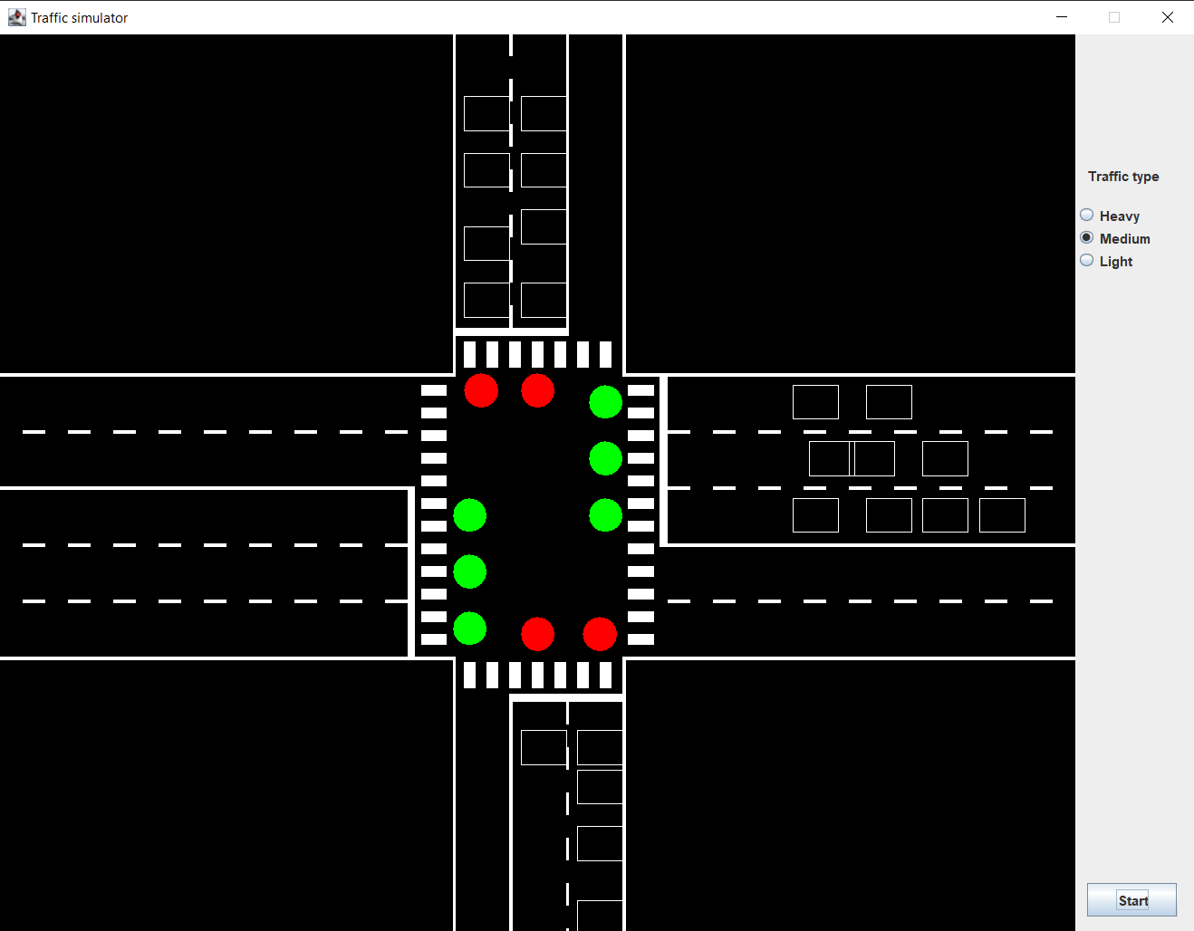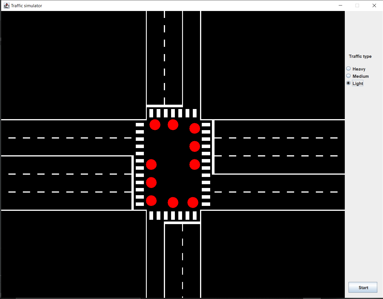 I built a traffic intersection with traffic lights and moving cars. it was built using java Swing and Threads I hope you like it Section 2 - Programmation concurrente de l’application L’utilisation de principes de programmation concurrente se fait notamment dans les 3 classes java suivantes ● SimulationManager du package controller ● CarsGenerator du package common ● TrafficLight du package common Le groupe a préférer choisir l’implémentation de interface Runable à l’héritage de la classe Thread pour plusieurs raisons, on en cite le partage des objets qui est très important dans ce type de projet, aussi la liberté laissée par l’inteface ( pas de restriction quand a l’utilisation d’autres classes (héritage non possible avec classe thread), la possibilité d’implémenter d’autre interfaces ... tout cela à été déterminant quand a ce choix décisif) 1- Simulation Manager : Cette classe est la classe principale responsable de la plus grande partie de la simulation.