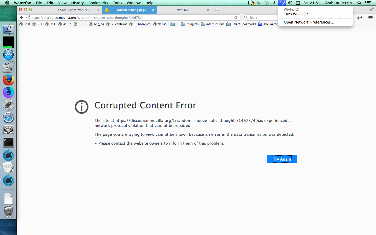 Unfortunately I no longer have the affected profile. Either that, or the service worker was automatically un-registered at some point. With 56.2.1 (and 56.2.2) I can 'fake' registration by editing then locking With build 20180714033244 of 56.2.2 I can reproduce the symptom if there's no network connection: – however, that's an edge case (I did not make any offline test in May or June) and maybe a separate Mozilla bug. I shouldn't keep this issue open for that alone. For me it'll be sane to verify in a FreeBSD environment where I need not fake service worker registration. However we should not assume that the www/waterfox experiment will reach 56.2.2. More practically: I reckon, seek verification of the fix in Windows case #694 after 56.2.2 is released. |