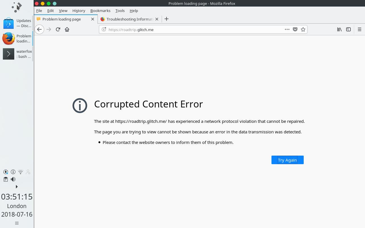 Re: cramforce/roadtrip#7 (comment) I had previously left the application, in Firefox, Finding my location then closed the notebook for ... I don't know how long. Days, probably. This morning the reported corrupted content error (network protocol violation) occurred very shortly after I opened the notebook. Can't recall whether I attempted to reload the page. |