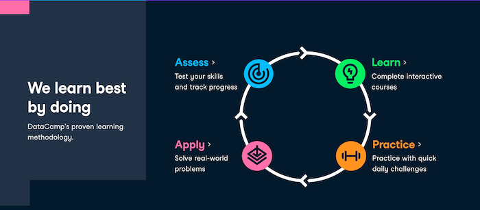 It’s an online learning platform that focuses on learning data skills at your own pace. Its learning methodology is broken into a 4 part process: Assess, Learn, Practice and Apply, that helps to give learners a well-rounded learning experience.