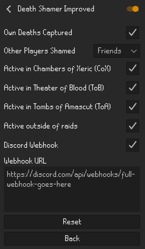 Open up Runelite and go to the settings for Death Shamer. Click the box to turn on Discord Webhook support and then paste the URL into the text box.