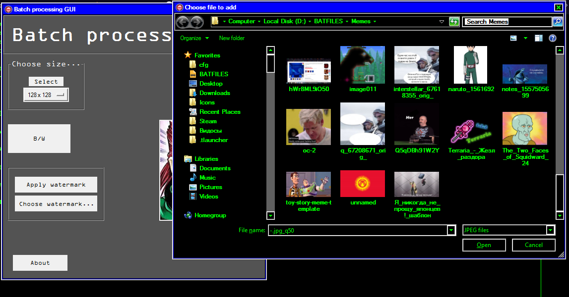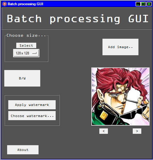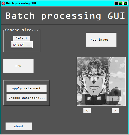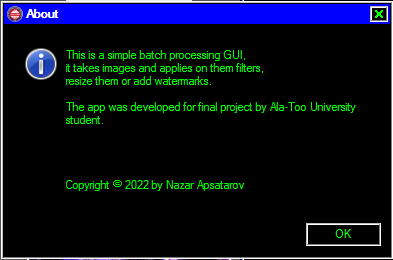 As I said before, this app process images. For that I used pillow library. The GUI itself is made using tkinter lib. I've decided to use this 2 libs, because I used them before in previous projects and they perfectly match for the batch processing purpose. The app didn't have that much of filters, but it's related to not having enough time. But there is no problems to add any other filter in the future, because the main app anatomy is ready.