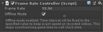 When the Offline Mode property is enabled, it explicitly controls the application frame rate via Time.captureFramerate. In this mode, application time is decoupled from wall-clock time so it's guaranteed that no frame dropping happens. This is useful when using the capture component to output pre-render footage.