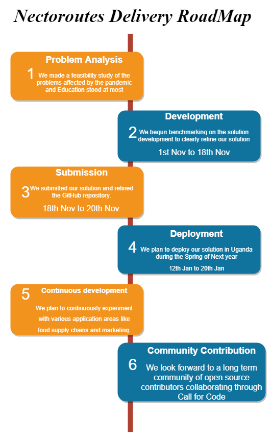 Nectoroutes uses location data to create a centralised points that schools can use to deliver learning resources to learners. The capabilities such as Machine learning, Watson studio and the IBM SPSS Modeler; Nectoroutes adds a value chain of accurate predictions in future demand and resource availability such that schools can ensure resilience and effectiveness while planning for their learners. The distribution chains can be optimised to reduce costs on both the parents and the schools sides and this is also backed up by increasing parents' confidence in the schools and institutions that are working to see that learners have access to learning resources and materials. The intelligent systems ensure a balance and qualitative analysis in resource distribution which is the main challenge affecting many to ensure that all learners have access to equitable and quality education.