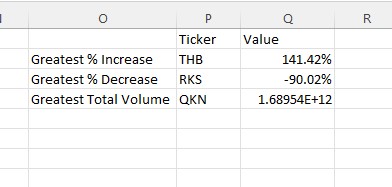 - Sub Retrieve Largest Change.doc: this file contains the VBA code written to run through the outcome of a given year and retrieve the greatest Percent Change, greatest Percent Decrease and greatest Total Volume.