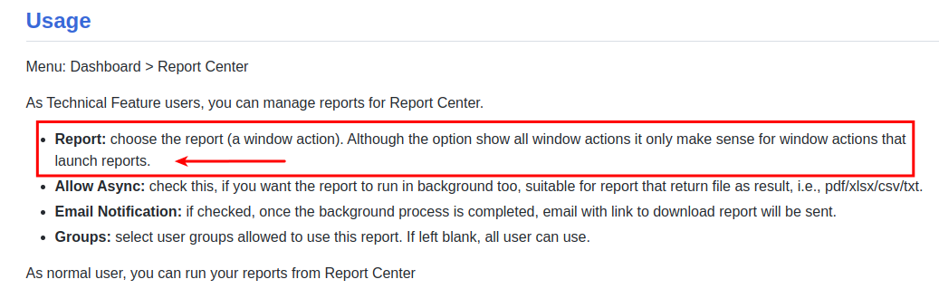 @kittiu The functionality is to generate reports async directly from the form view itself, and not have to go into the "Report Center" specifically to do it. So you press Print, you get a popup asking you if you want to run it Async, and then to verify the email address that it should be sent to.