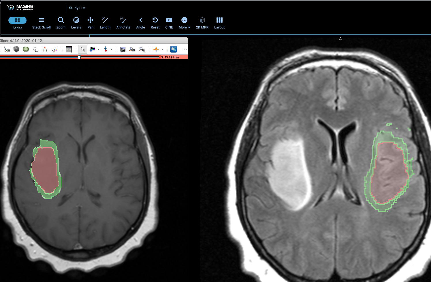 We have an inconsistency in displaying segmentation for T1 for this study (and for all segmentations in LGG/GBM collections) between Slicer and OHIF.