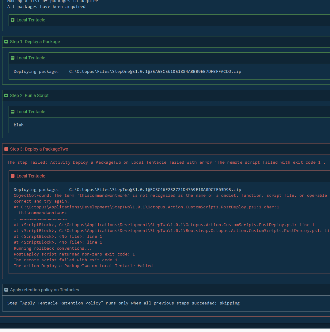 | Success: Applying retention policy using 3 Items to set Environments-1/Projects-181/Step-Deploy a PackageTwo/Machines-1/<default>