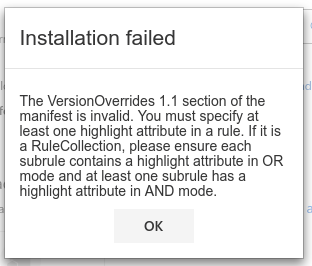 Using the XML manifest from the Outlook-Add-in-Contextual-Regex example for testing, when changing the ItemHasRegularExpressionMatch Rules from BodyAsPlaintext to BodyAsHTML outlook throws an error: