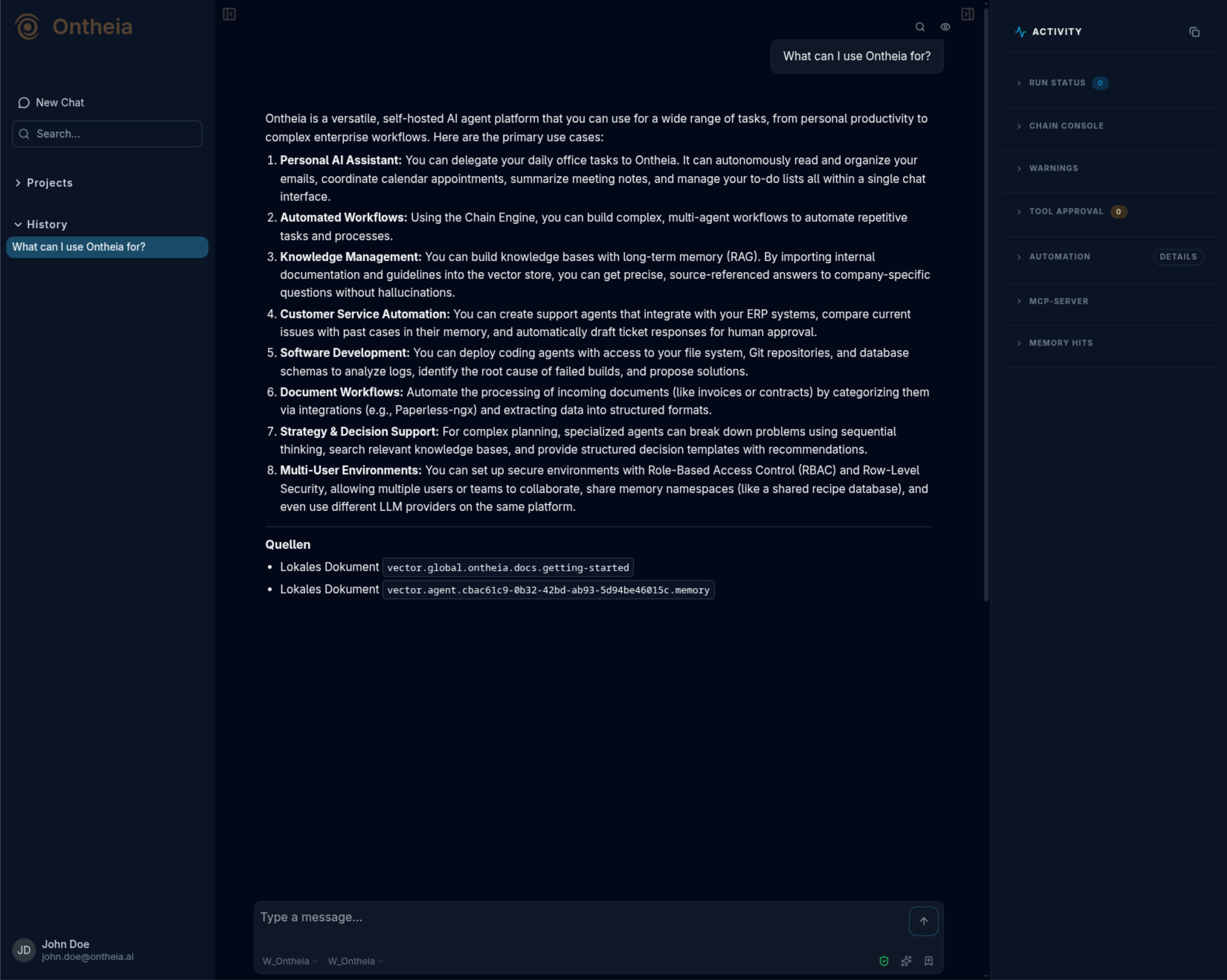 Ontheia is a self-hosted, open-source AI agent platform. Run AI agents, automate workflows, and connect AI models to any tool — entirely on your own infrastructure, without sending data to external cloud services.