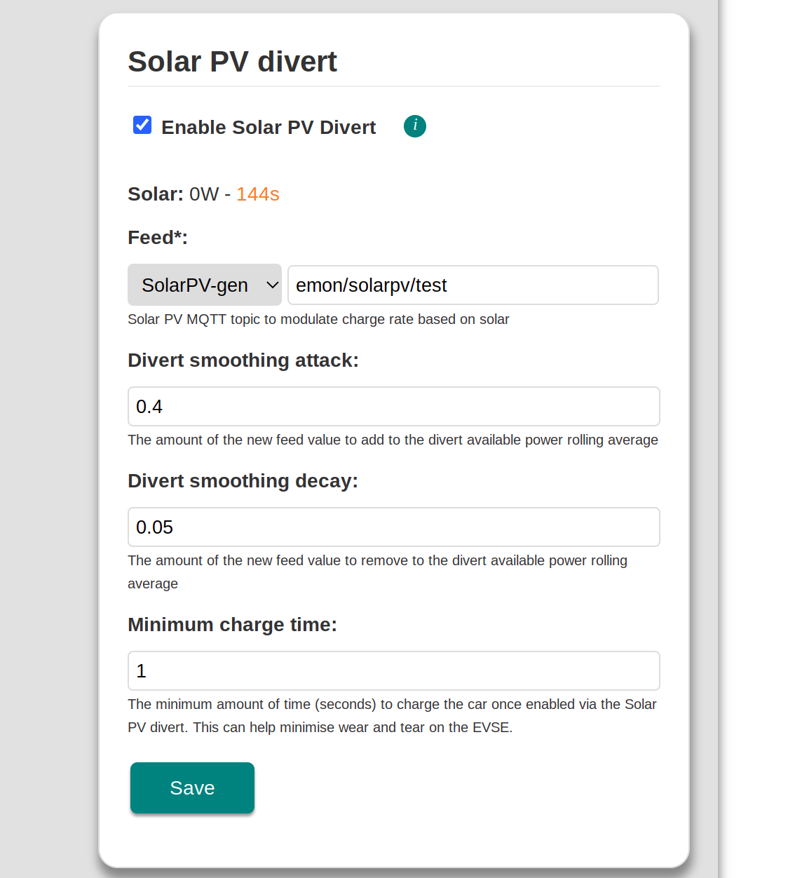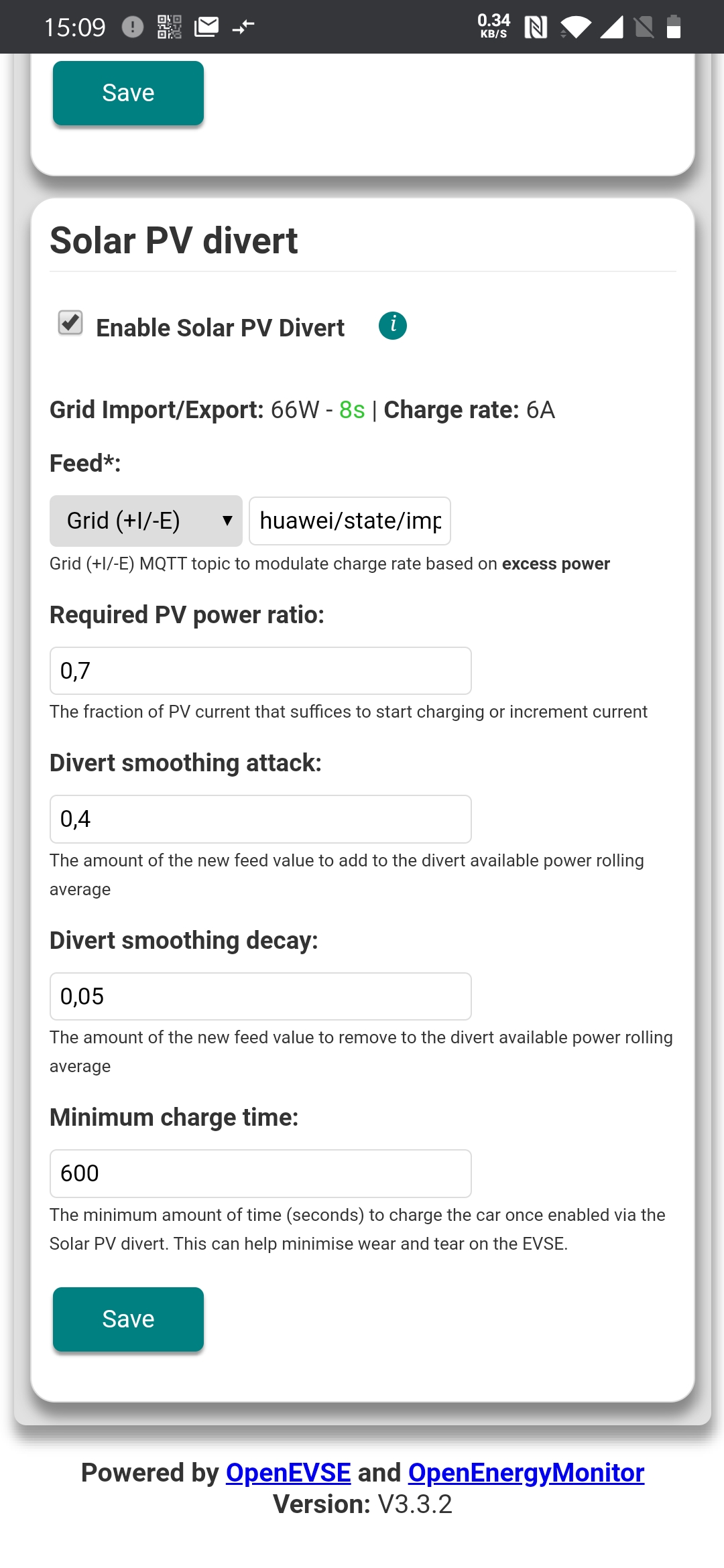 Hello Glyn, Yes. After I sent the simulations to Jeremy I actually flashed my Open EVSE with it and it works just fine. It changes a lot for me. I have 3kW panels, with work at home, we easily use 900W for various items (up to 4 computers are on) and on a sunny day it leaves around 1500W export and the open EVSE wallbox... would never start. Now, setting the ratio to 0.5 (which is safe, above my supposedly optimal value of 0.39) my car has charged several hours today, at minimal marginal cost. Just great :-) |