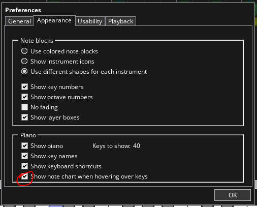 "Show note chart when hovering over keys" automatically turns back on (box ticked) when you restart nbs, and "No fading" turns off (box UNTICKED) when you restart too (I always have the box unticked anyway so that's fine but, still).