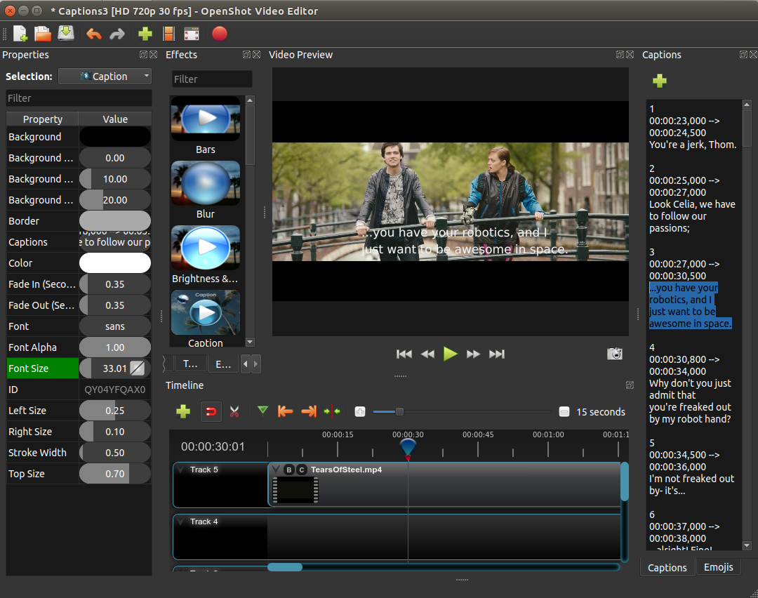 This is a new effect, which allows for VTT or Subrip caption data to be displayed over a clip. Many different keyframes are available, from font-size, color, background color, alpha, corner radius, padding, font family, stroke, etc... Also, word-wrap is supported, and custom margins for left, top, and right (didn't include bottom because I didn't want to crop the text off). You can also set/animate a custom fade-in / fade-out for each caption, which gives it a nice animated look.