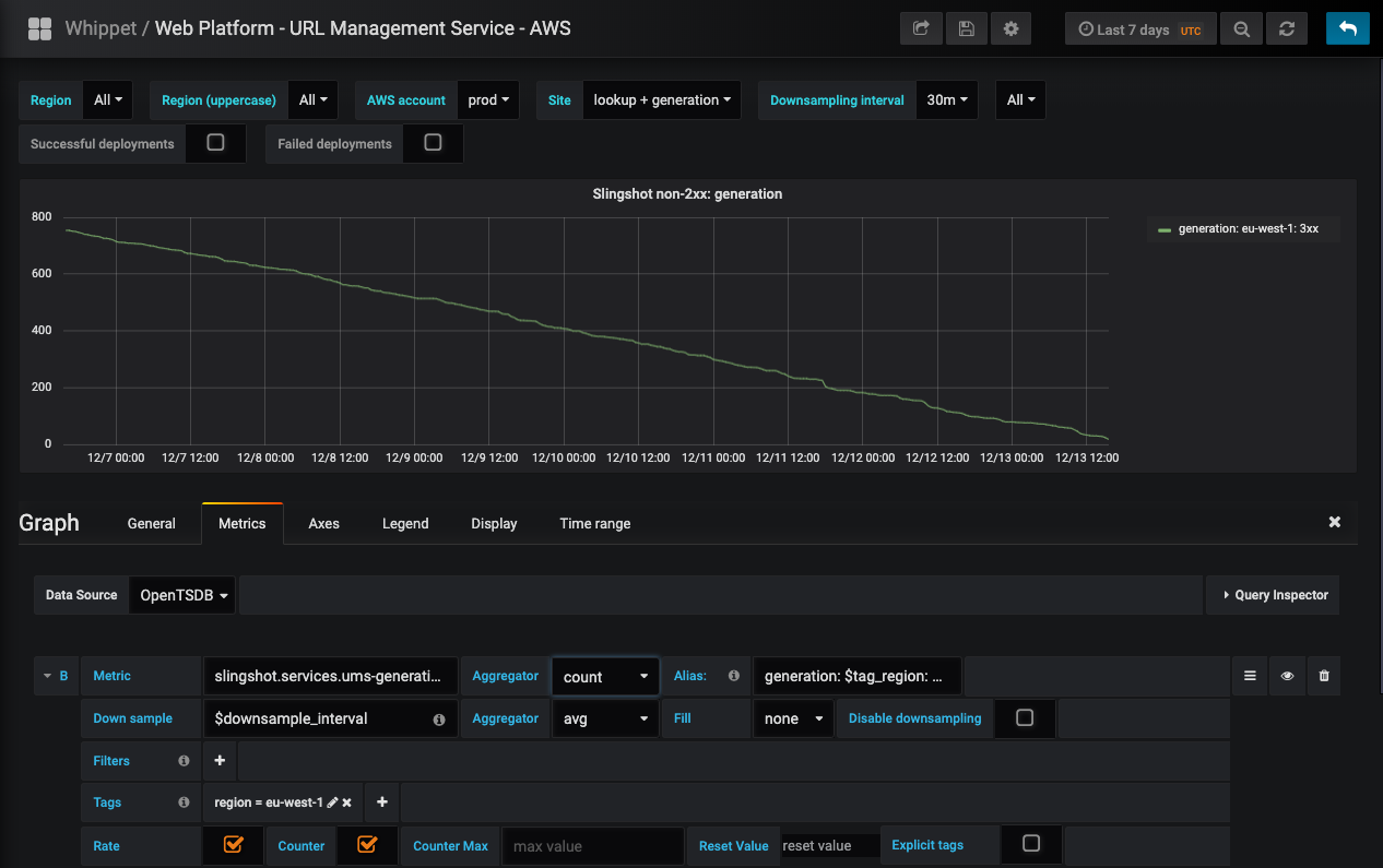 However, when rate is enabled, AggregationIterator deliberately skips over the first value in each time series during initialisation. In so doing, I believe it causes the timestamp to become non-zero and thus all time series in the aggregation begin contributing from the start, potentially long before we have actually advanced to their start time. This is why the average is so low in the past and climbs towards the present! It's getting biased towards zero by hundreds of inactive time series.