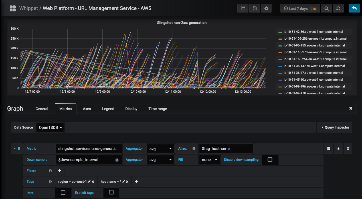 This is a lot to take in! We've taken off the rate calculation and removed the aggregation across hosts so we can see each separately. That's our 754 separate time series, each counting up separately. Over the course of a week, each only exists for a little while before vanishing, although some come back again later as the host is re-used. Here's one more graph: