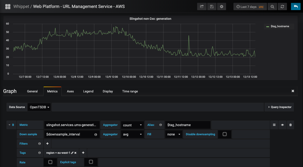 This also looks fishy. We start with 754 time series 7 days ago and fall to 21 time series just now. Here's the raw time series without the rate calculation or the aggregation across hosts: